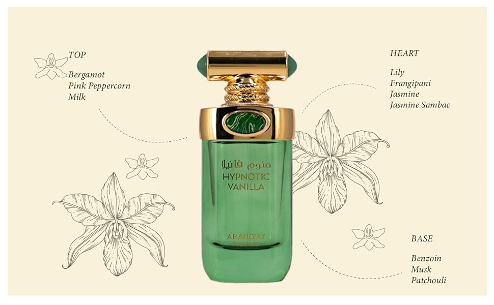 Introducing Arabiyat Prestige Hypnotic Vanilla – an enchanting fragrance that captivates and mesmerizes. This perfume is a harmonious blend of exotic and comforting notes, creating an irresistible allure that lingers all day. It opens with a burst of fresh bergamot, complemented by the spicy nuance of pink peppercorn and a hint of creamy milk, adding a smooth and inviting start. At its heart, a floral symphony unfolds with the delicate scent of lily, the exotic allure of frangipani, and the timeless elegance of jasmine and jasmine sambac, creating a hypnotic and enchanting aura. The base notes provide a warm and sensual foundation with the sweet and resinous scent of benzoin, the musky allure of musk, and the earthy richness of patchouli, leaving a lasting and captivating impression. Hypnotic Vanilla embodies elegance and sophistication, perfect for those who seek to leave an unforgettable mark wherever they go. Indulge in the magic of Hypnotic Vanilla and let its spellbinding aroma enchant your senses.