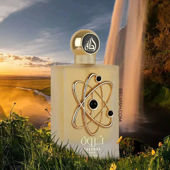Tharwah Gold de Lattafa Perfumes es una fragancia floral ambarada para mujer. Una fragancia dulce con sutiles toques florales provenientes del jazmín, la lavanda y el azahar. Su entrada es principalmente dulce, seguida de una nota floral dulce y un final cálido y dulce.