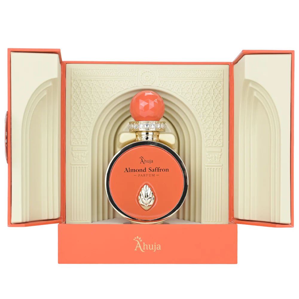 AHUJA Almond Saffron – 3.4 oz Parfum | Unisex Warm Floral Saffron Scent | 35% Long Lasting Oil | Saffron, Jasmine, Orange Blossom, Rose, Ambergris, Cedarwood | Luxury Orange Gift Box