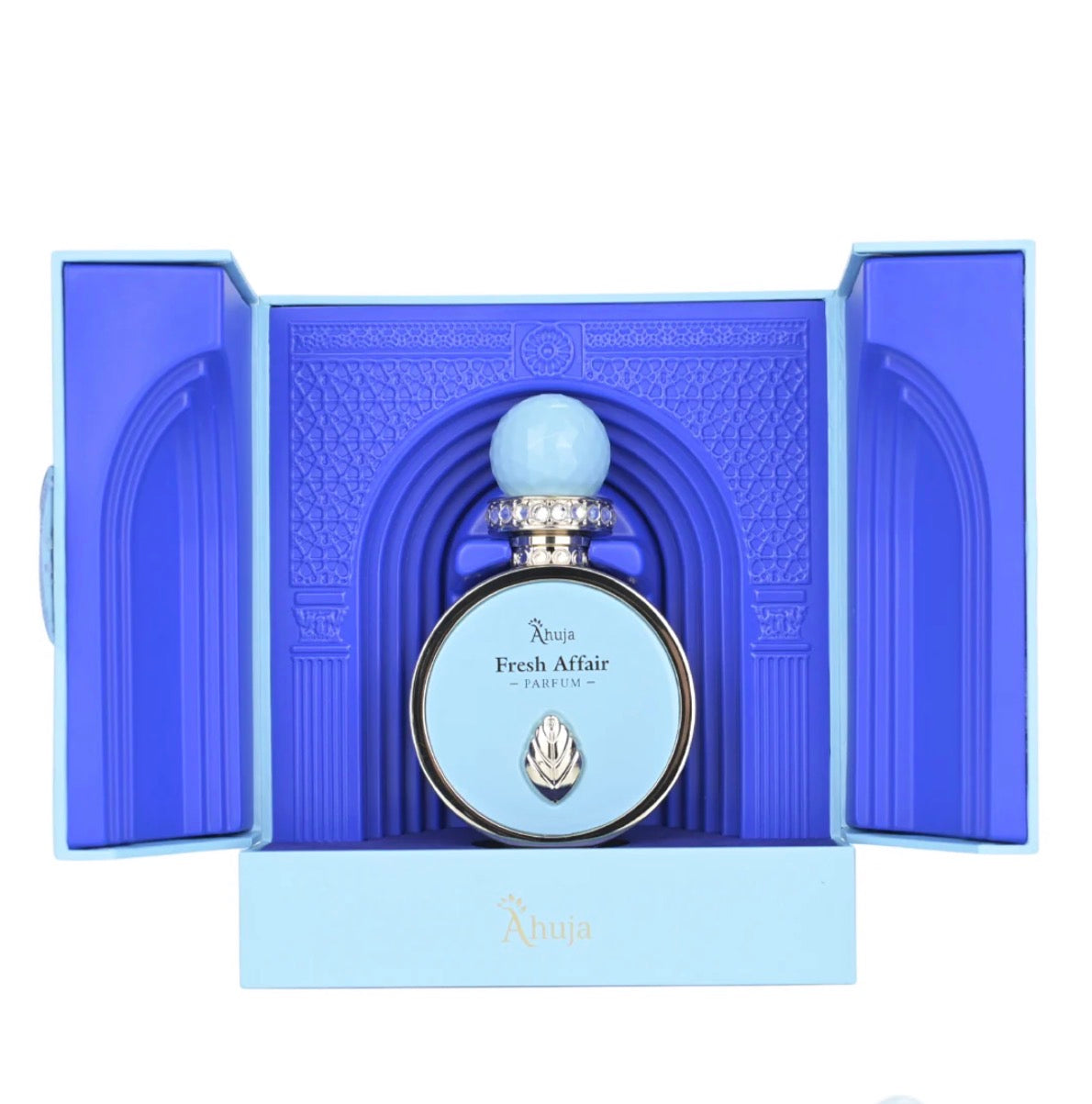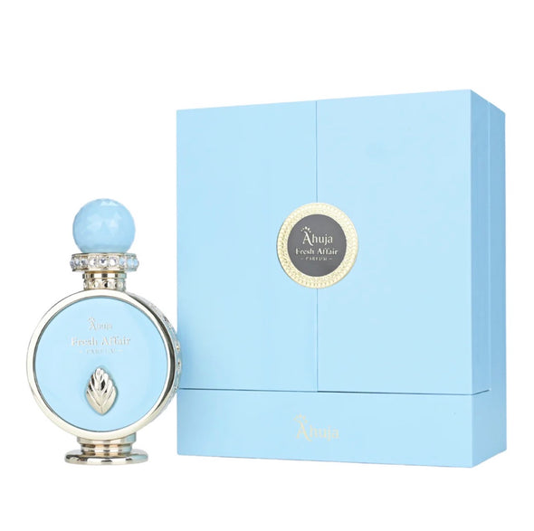 AHUJA – FRESH AFFAIRS | “Some light stays with you.” Fresh Affairs isn’t about summer — it’s about the way light makes you feel. The fragrance opens like morning sun spilling through linen: a lively burst of lemon and solar accord, lifted by soft jasmine petals. The feeling is immediate — bright, airy, and quietly radiant. At the heart, frangipani and ylang-ylang bloom in golden warmth. Creamy, floral, and exotic, they blend with more jasmine to create a glow that feels like skin warming under the first light of day. As it settles, smooth sandalwood brings a soft calm. Not heavy — but gentle, grounding, and luminous, like sunlight diffused through clouds. Fresh Affairs is the mood between moments — the breath before a memory. A scent of quiet radiance, soft intimacy, and lasting freshness. Packaged in a stunning light-blue luxury box with embossed texture, gold detailing, and aqua-marble inner wings, Fresh Affairs presents itself as a piece of fragrance art.