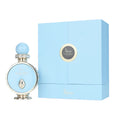 LUXURY GIFT BOX PACKAGING (BLUE EDITION) Presented in a premium textured light-blue box with gold accents, marble-aqua interior, and a gold-arched chamber framing the bottle. Gift-ready for any occasion.