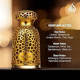 Notas de fondo: pachulí, ámbar gris, cachemira y cedro.
